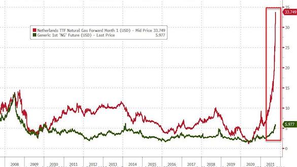 Газ в США также дорожает с рекордной за 13 лет скоростью, но угнаться за газовыми котировками по другую сторону Атлантики бессилен: на хабе Henry Hub он стоит 5,97 доллара за млн британских тепловых единиц (БТЕ), а на хабе TTF в Нидерландах — почти 34 доллара.