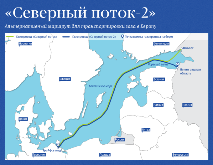 Проект «Северный поток-2» предполагает строительство двух ниток газопровода общей мощностью 55 миллиардов кубометров газа в год от побережья РФ через Балтийское море до Германии. Новый трубопровод планируется построить рядом с «Северным потоком». Против реализации проекта выступает ряд стран, в частности Украина, которая опасается потерять доходы от транзита российского газа, и США, имеющие амбициозные планы по экспорту в Европу своего СПГ.