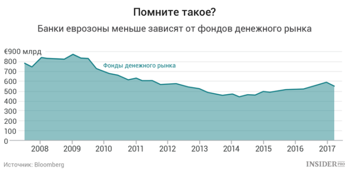 Теперь банки более устойчивы. По крайней мере, уровни достаточности капитала увеличились, и банки меньше полагаются на краткосрочное финансирование. На графике видно, насколько сократилось использование банками еврозоны средств денежного рынка.