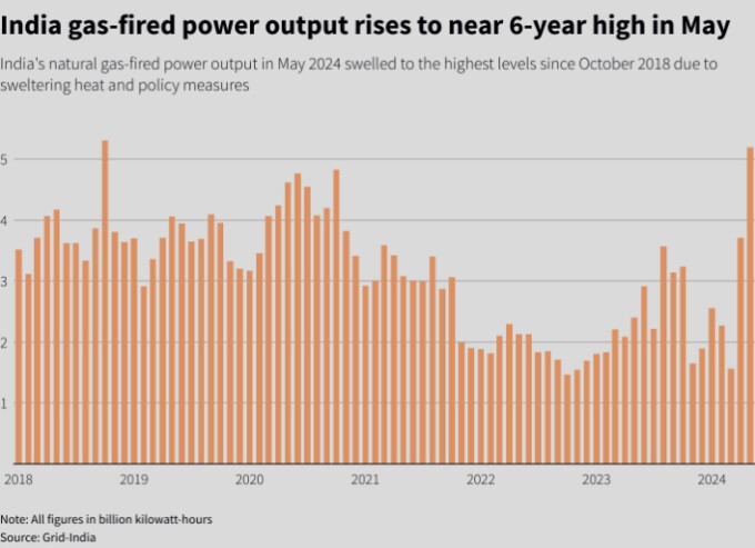 По данным Grid India, выработка электроэнергии на газе в стране удвоилась в апреле и мае до 8,9 миллиарда киловатт-часов (кВтч) по сравнению с тем же периодом прошлого года, впервые с момента принятия закона о сжигании угля.