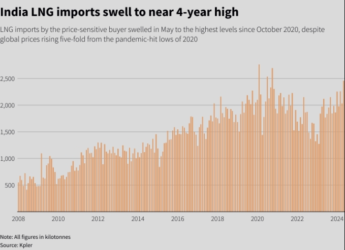 Спрос на СПГ в Индии, четвертом по величине импортере топлива в мире, увеличится на 19% в 2024 году, при этом прогнозируется, что импорт превысит 28 миллионов метрических тонн в 2025 году по сравнению с 22,1 миллиона тонн в 2023 году, согласно прогнозам ICIS.