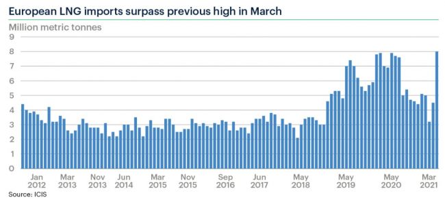 По данным ICIS, в марте Европа импортировала рекордные объемы СПГ — 8 млн тонн (11 млрд кубометров). Примерно столько же она получала только зимой и весной 2020 года. По сравнению с январем и февралем этого года поставки выросли в два и более раза.