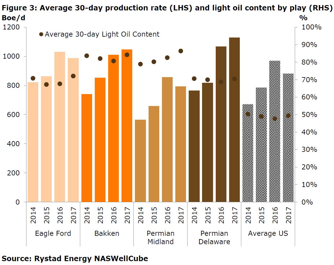 На рисунке 3 показана средняя 30-дневная скорость производства и содержание легкой нефти для горизонтальных скважин в сланцевых месторождениях. Месторождение Eagle Ford показало самую высокую среднюю 30-дневную ставку IP в промышлености. С 2014 года наблюдается заметное увеличение производительности скважин во всех крупных сланцевых месторождениях, а Permian Delaware продемонстрировал на сегодняшний день самое крупное улучшение — средняя скорость IP увеличилась на 48%, увеличившись с 760 баррелей нефтяного эквивалента в день в 2014 году до более 1100 баррелей нефтяного эквивалента в день в 2017 году. Производители в Permian Delaware перешли на бурение более длинных боковых сторон, улучшили методы завершения скважин (например, увеличили среднюю загрузку проппанта в перфорированную боковую поверхность) и сосредоточились на активности в основных областях месторождения. Среди четырех ведущих сланцевых месторождений, Permian Midland реализует самый высокий процент легкой нефти с 2016 года и, по оценкам, достигнет 86% в 2017 году.