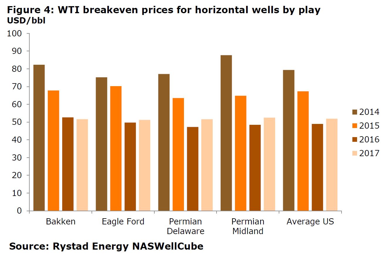 Несмотря на то, что во второй половине 2014 года цена на нефть значительно снизилась и все еще остается на относительно низком уровне, добыча легкой нефти из американских сланцевых месторождений оставалась довольно устойчивой в течение этого периода и достигла минимума в 3 квартале 2016 года. Добыча легкой нефти приняла растущую тенденцию с начала 2017 года. Повышение эффективности бурения и улучшение производительности скважин способствовали значительному снижению безубыточных цен, что позволит производителям адаптироваться к низкой ценовой конъюнктуре и вернуться к сокращению производства. Несмотря на это, циклические эффекты затрат, как ожидается, будут повышать безубыточные цены. Цены на нефть WTI, выше $55 за баррель, будет достаточно для продолжения развития сланцевой промышленности США в следующем году.