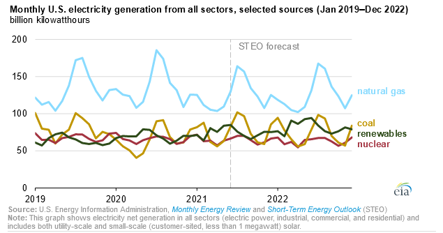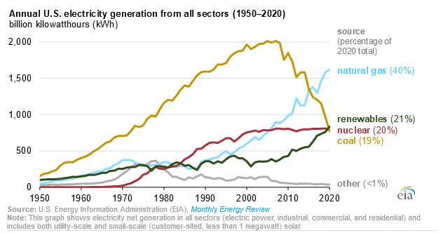 Уголь был крупнейшим источником электроэнергии в Соединенных Штатах до 2016 года. Ожидается, что в 2021 году производство электроэнергии на угле в США увеличится, поскольку цены на природный газ будут продолжать расти, а уголь станет более конкурентоспособным с экономической точки зрения. По прогнозам, производство электроэнергии на угле во всех секторах в 2021 году вырастет на 18% по сравнению с показателями 2020 года, а затем упадет на 2% в 2022 году. Атомная электроэнергетика снизится на 2% в 2021 году и 3% в 2022 году, поскольку операторы выведут из строя несколько генераторов.