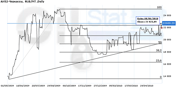 Что касается внутреннего рынка, то трейдеры ожидают повышения, объясняя его тем, что низкие цены по мировой нефти заставляют отыгрываться на внутренних ценах. К тому же, чтобы получить прибыли компании вынуждены экспортировать более крупные объемы нефтепродуктов, тем самым обделяя внутренний рынок высокооктановыми бензинами, на которых установился сезонный спрос, что соответственно влияет на рост цен на бензины. Кроме того, приближение уборочной делает логичным повышение цен на летнее дизтопливо в конце июня.