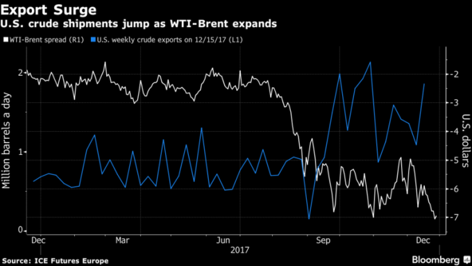 Разрыв стоимости между WTI и Brent во вторник достиг максимума за два года, так как взрыв на нефтепроводе в Ливии повысил глобальный бенчмарк. Это произошло после того, как ураган «Харви» приостановил поставки в США ранее в этом году, спровоцировав в дальнейшем рост экспорта в США. Рост сланцевой промышленности, которая, по прогнозам, обеспечит рекордные поставки на внутренний рынок США в 2018 году, может привести к усилению отрыва США от политики ОПЕК. «Если в первом полугодии мы получим больше сланцевой и канадской нефти, а ОПЕК приостановит сокращения, то разрыв между сортами нефти станет огромным», — сказал Richard Fullarton, основатель лондонского хедж-фонда Matilda Capital Management Ltd.