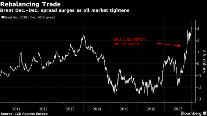 Нефть марки Brent в этом году выросла против WTI, поскольку сокращение добычи ОПЕК привело к уменьшению мировых поставок. Фьючерсы на декабрь 2018 года достигли самой высокой премии по сравнению с тем же месяцем в 2019 году на этой неделе. Сокращения ОПЕК приведут рынок нефти к балансу в следующем году, по словам Abhishek Deshpande, начальника нефтяных исследований компании JPMorgan Chase & Co.