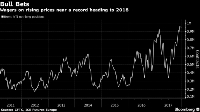 Рынок вступает в 2018 год с рекордным количеством бычьих ставок по Brent и WTI. Эти контракты, которые теперь превосходят по количеству медвежьи в семь раз, привели к опасениям, что нефть вскоре может пойти на спад из-за спекуляции. «Трудность состоит в том, что мы не знаем тип игроков. Если они хотят иметь большую часть своих активов в сырьевых товарах в течение следующих двух лет, то они не будут продавать эти позиции», — сказал Torbjorn Kjus, главный нефтяной аналитик DNB Bank ASA.