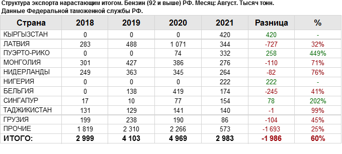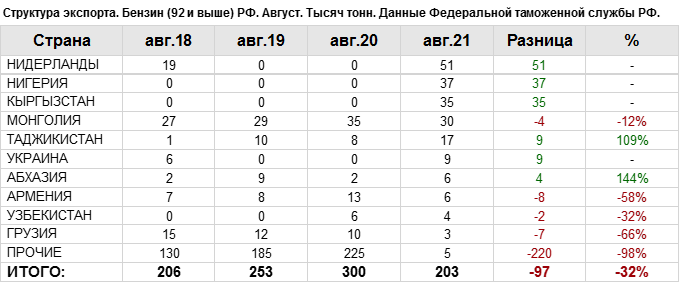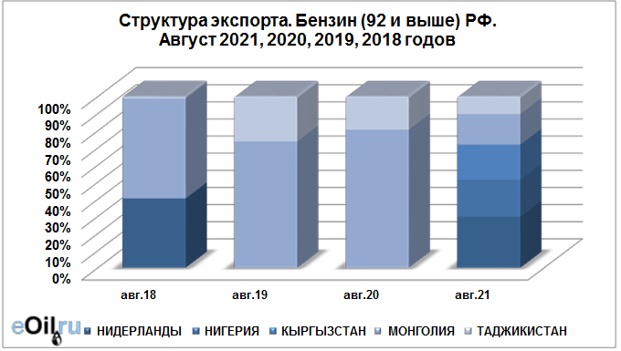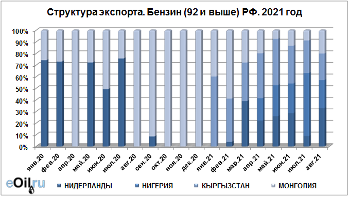 Структура экспорта бензина (92 и выше) из России с января 2021 по август 2021