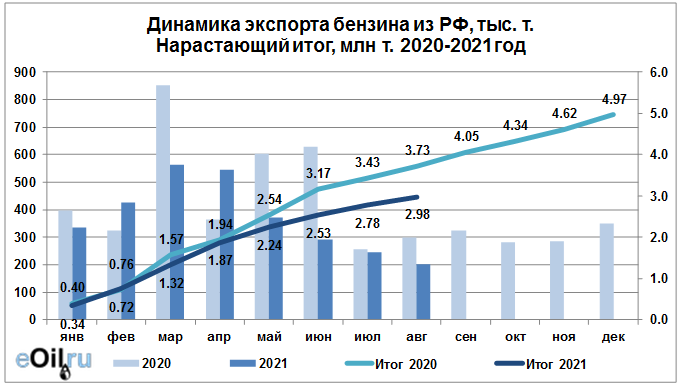 В 2021 году объем поставок бензина (92 и выше) на экспорт достиг 2983.05 тыс. тонн. Данный объем на текущий момент составляет 60% от объема прошлого 2020 года.