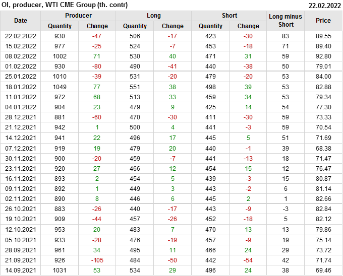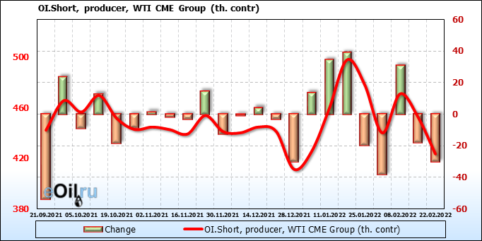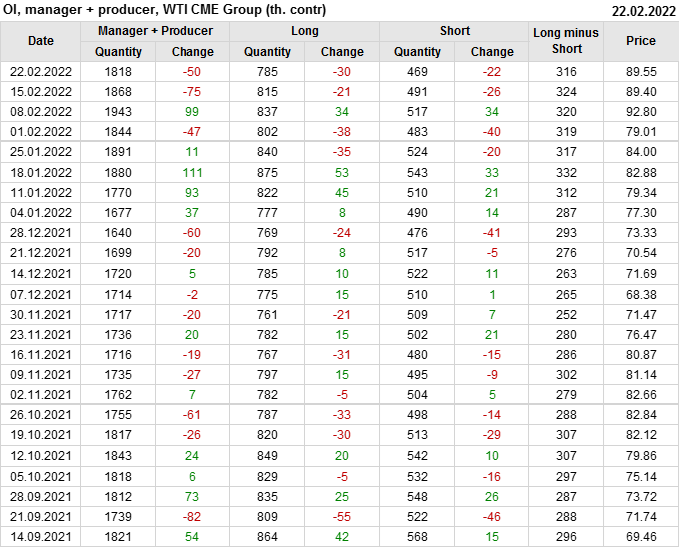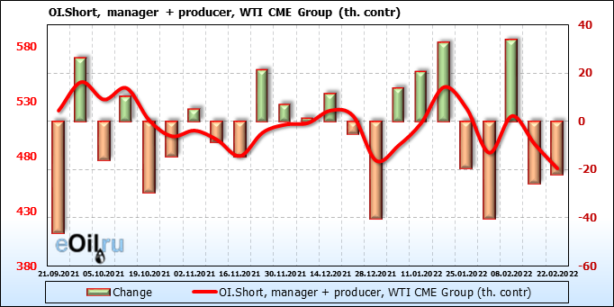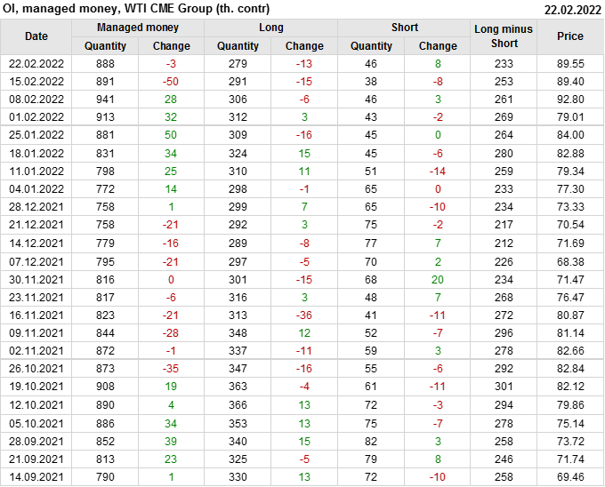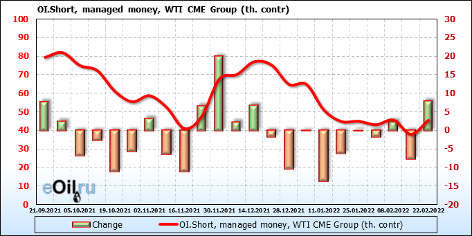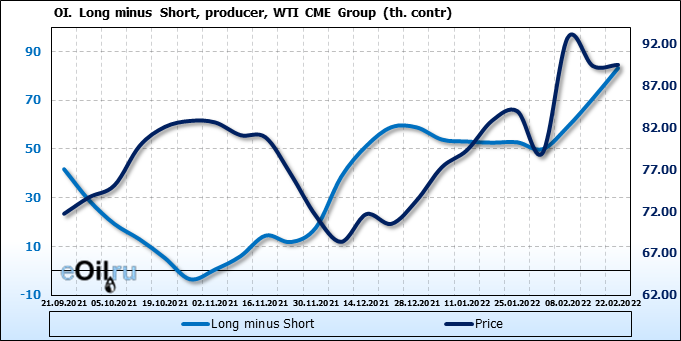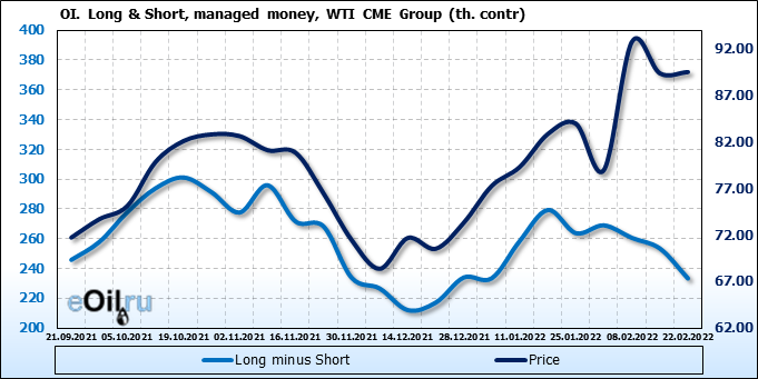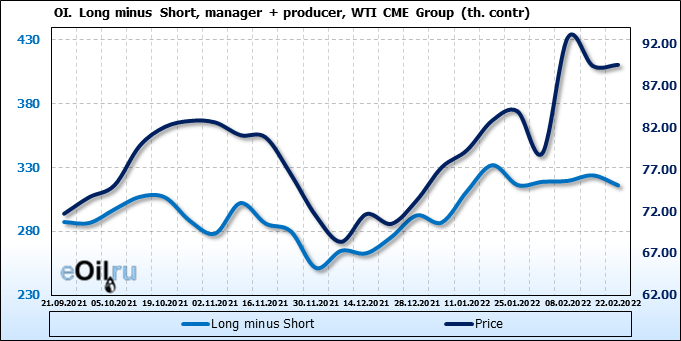 За прошлую неделю, 16.02.22 — 22.02.22, разница между длинными и короткими позициями управляющих сократилась на 20.2 тыс. контрактов. В тоже время, цена выросла на 0.15 доллара.