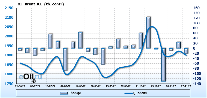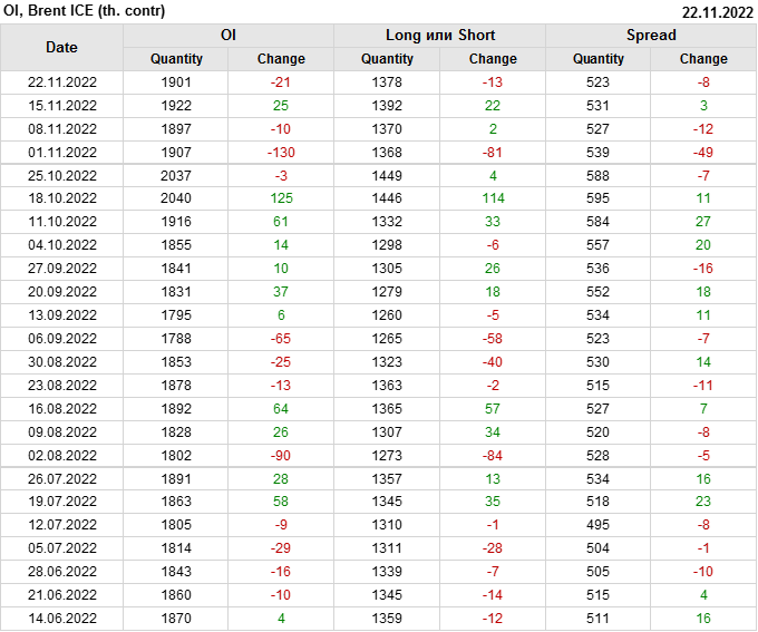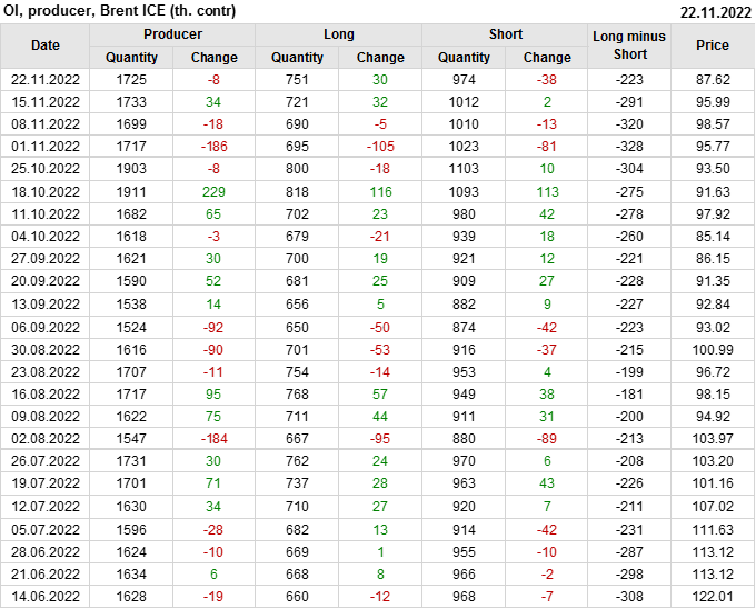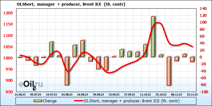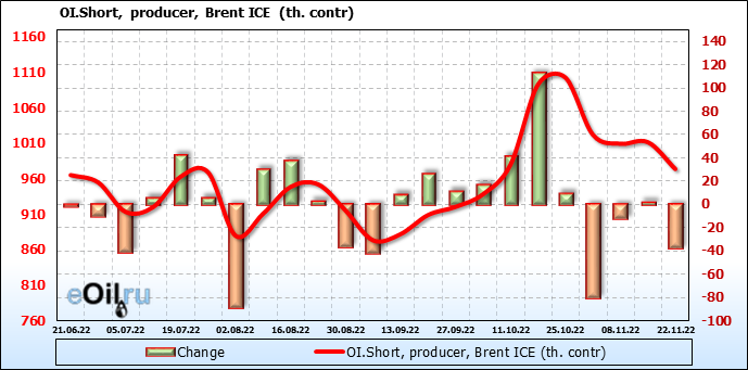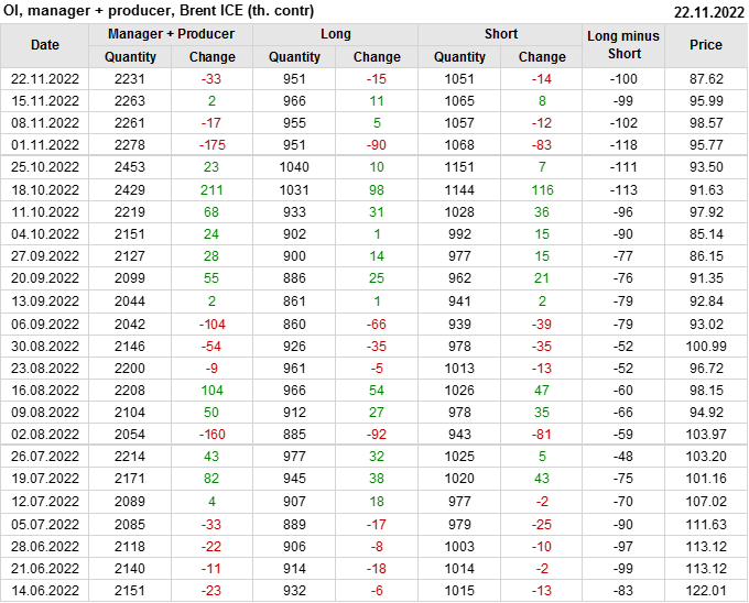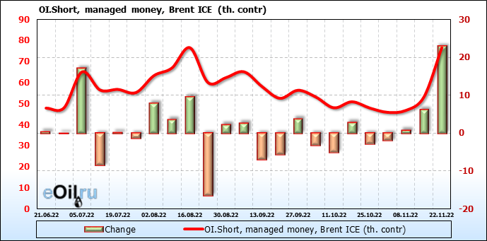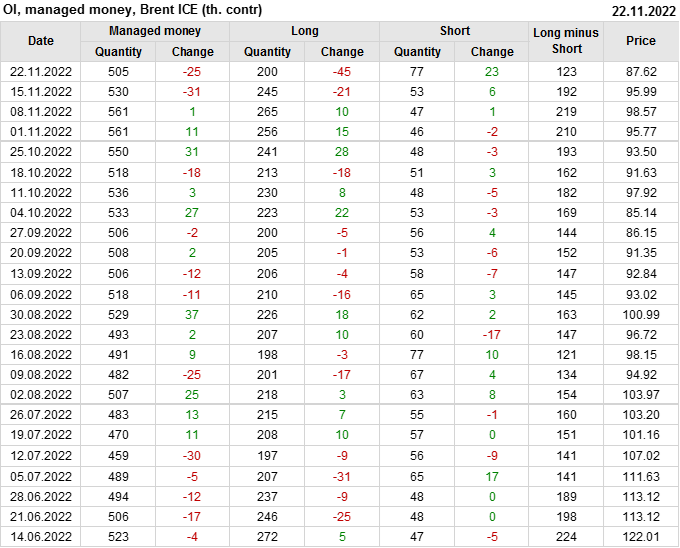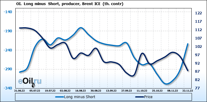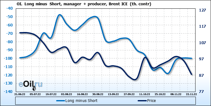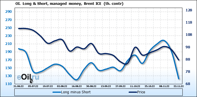 За прошедшую неделю, 16.11.22 — 22.11.22, разница между длинными и короткими позициями управляющих сократилась на 68.3 тыс. контрактов. В тоже время, цена упала на 8.37 доллара.