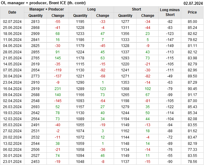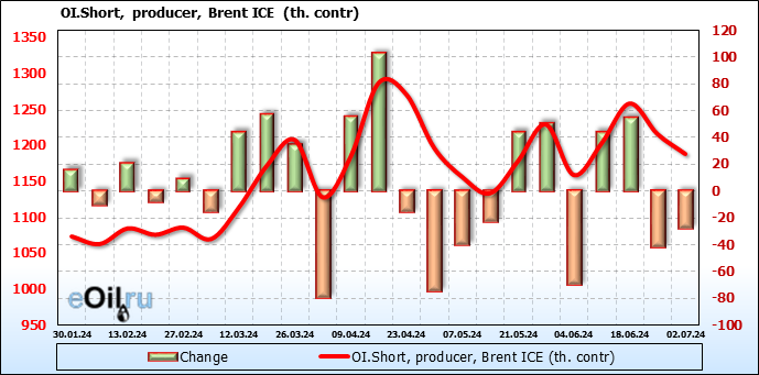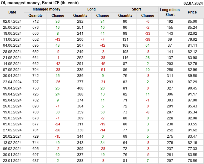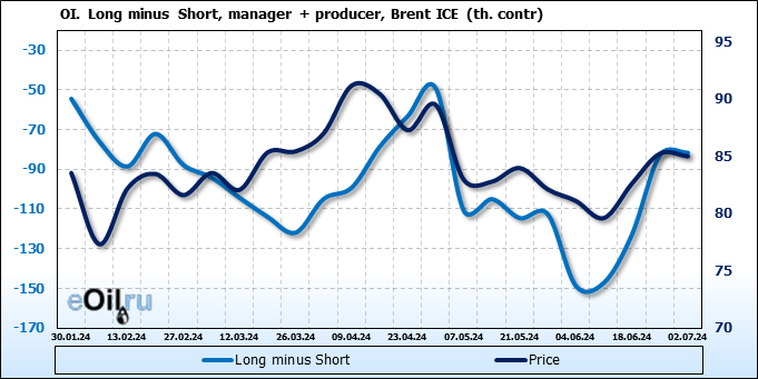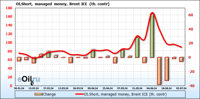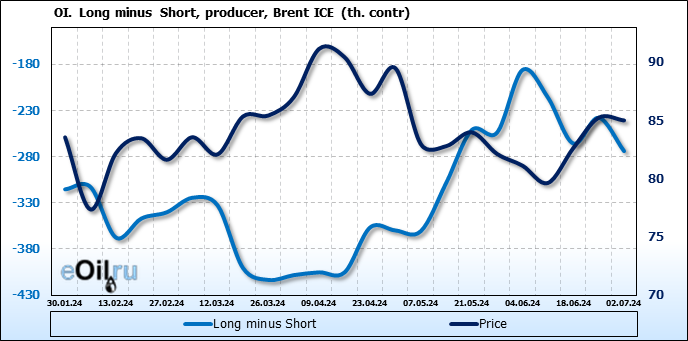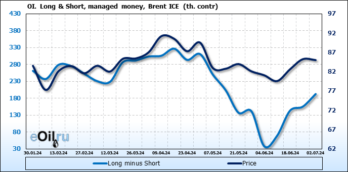 За прошедшую неделю, 26.06.24 — 02.07.24, разница между длинными и короткими позициями управляющих увеличилась на 37.3 тыс. контрактов. В тоже время, цена упала на 0.24 доллара.