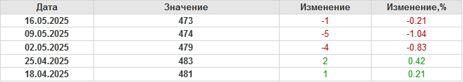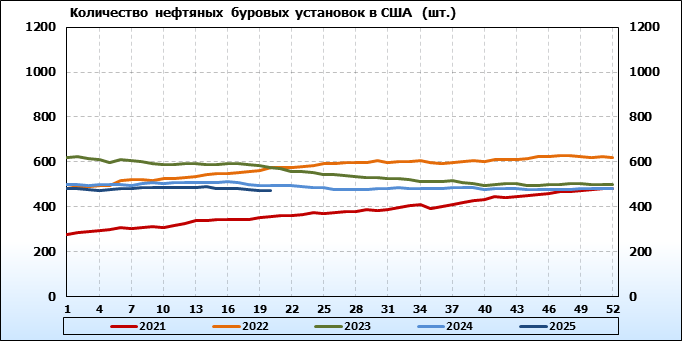 По сообщению Baker Hughes количество нефтяных буровых установок в США на 16.05.25 составило 473 штуки. За неделю количество буровых установок упало на 1 единицу.