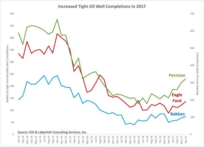Обеспокоенность рынков тем, что объемы добычи нефти в США сведут на нет усилия ОПЕК, вполне обоснованны. По состоянию на 2017 год, показатели освоения новых скважин в Bakken, Eagle Ford и Permian basin весьма велики (рисунок 4).