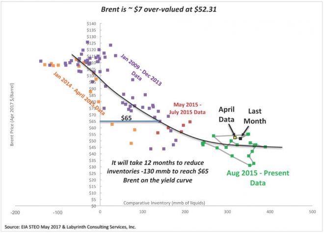По состоянию на апрель, запасы нефти в странах Организации экономического сотрудничества и развития составили на 300 миллионов баррелей больше среднего пятилетнего показателя. Вид кривой соотношения цены и сравнительной инвентарной доходности запасов нефти свидетельствует о том, что цена Brent $52 за баррель преувеличена на $7 за баррель (рисунок 5).