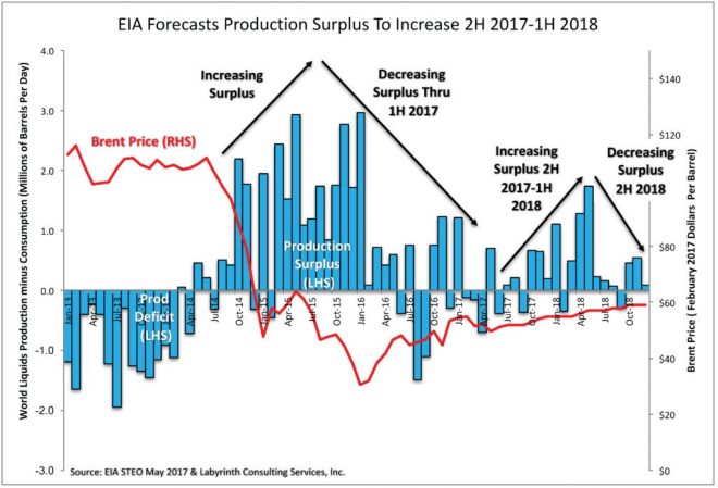 Если текущая ситуация кардинально не изменится, то для снижения объемов мировых запасов нефти до уровня, на котором нефть марки Brent будет торговаться за $65 за баррель, может понадобиться год. С другой стороны, Управление энергетической информации прогнозирует относительно небольшое сокращение запасов нефти в странах Организации экономического сотрудничества и развития в 2017 году и увеличение запасов в 2018 году.