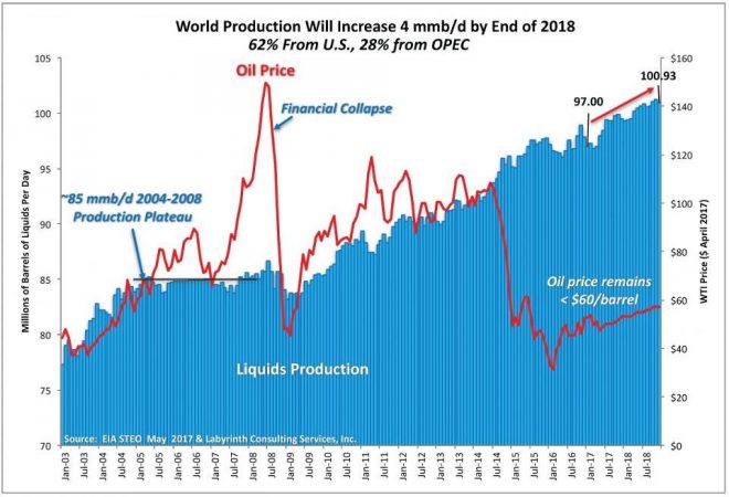 В связи с тем, что на протяжении 2018 года возможны новые скачки роста объемов добычи нефти с последующим их сокращением, не следует ожидать, что цена на нефть марки Brent превысит $60 за баррель до конца 2018 года.