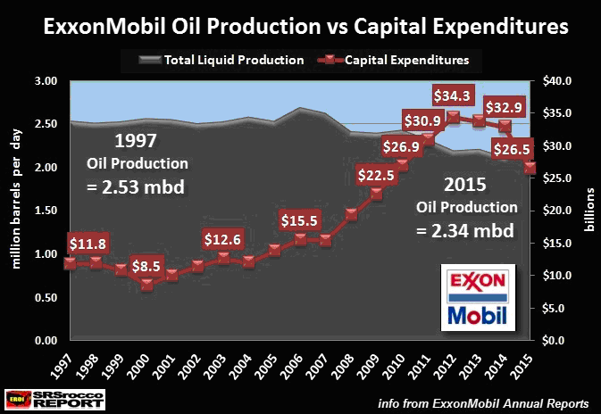Разумеется, продолжают работать ранее освоенные месторождения: Западная Курна в Ираке, Тенгиз в Казахстане, Верхний Закум в ОАЭ, производство СПГ на шельфе Катара, Сахалин-1 в России. Но здесь особого роста добычи ждать не приходится. А свежие запасы Эксон расположены, главным образом, на глубоком шельфе, где работы связаны с огромным риском, а при нынешних ценах и вовсе не реальны. К примеру, месторождение Hadrian South в Мексиканском заливе на глубине 2400 м открыто в 2009 году, но до сих пор компанией не осваивается.
