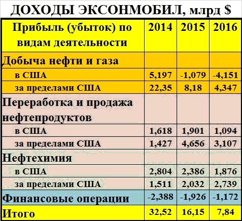 На суше Эксон ориентируется на трудноизвлекаемые (сланцевые) запасы США и Канады, кроме того, идет разведка подобных пластов в Аргентине. Недешево купленная XTO-Energy работает в 14 американских штатах, ее самые крупные нефтяные промыслы находятся на месторождениях Permian Basin и Bakken, газовые – на площадях Marcellus и Utica. Это, бесспорно, самые богатые сланцевые формации США. В прошлом году XTO-Energy добыла 9 млн т нефти и 36 млрд м3 газа, но из-за чудовищно низких цен вся выручка составила $4,4 млрд. Про таких оборотах затраченные $25 млрд вообще не окупятся, впрочем, даже если цены вырастут вдвое, для окупаемости потребуются десятки лет. А пока добыча нефти и газа в США принесла Эксону в 2016 г. $4 млрд убытков (см. таблицу).