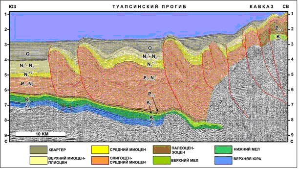 Туапсинский прогиб расположен на прибрежном склоне Черного моря с глубинами дна моря от 40 до 2100м. Длина прогиба 270 км, ширина около 40 км (рис.3). Лицензия на разведку нефти и газа принадлежит компании Роснефть.