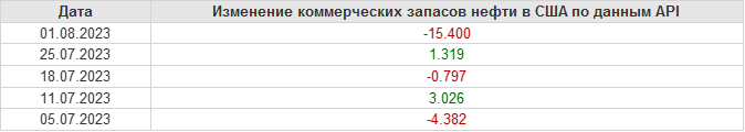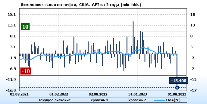 Коммерческие запасы нефти в США по данным института API упали на 15.4 млн. баррелей, при прогнозе -0.9 млн. баррелей.