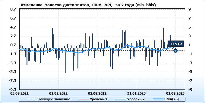 Запасы дистиллятов в США по данным института API упали на 0.512 млн. баррелей.