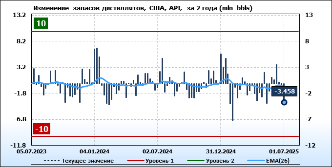 Запасы дистиллятов в США по данным института API упали на 3.458 млн. баррелей.