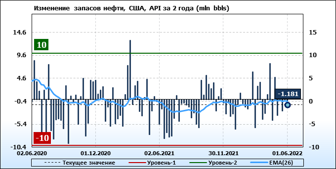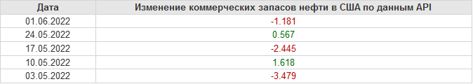 Коммерческие запасы нефти в США по данным института API упали на 1.181 млн. баррелей, при прогнозе -0.067 млн. баррелей.