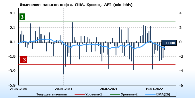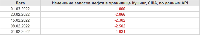 Запасы в хранилище Кушинг по данным института API упали на 1 млн. баррелей.
