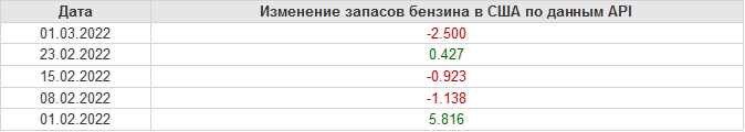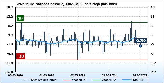 Запасы бензина в США по данным института API упали на 2.5 млн. баррелей.