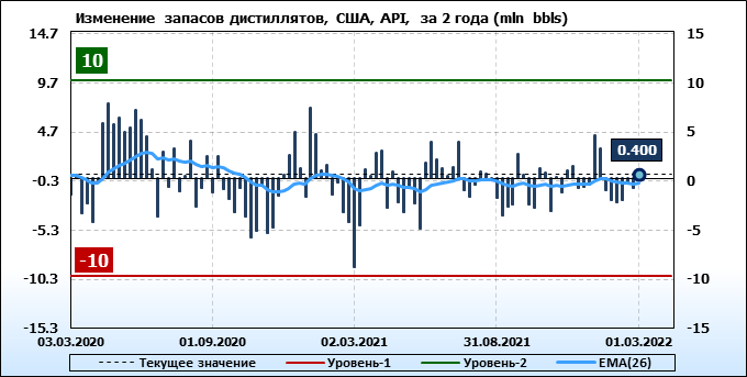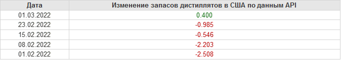 Запасы дистиллятов в США по данным института API выросли на 0.4 млн. баррелей.