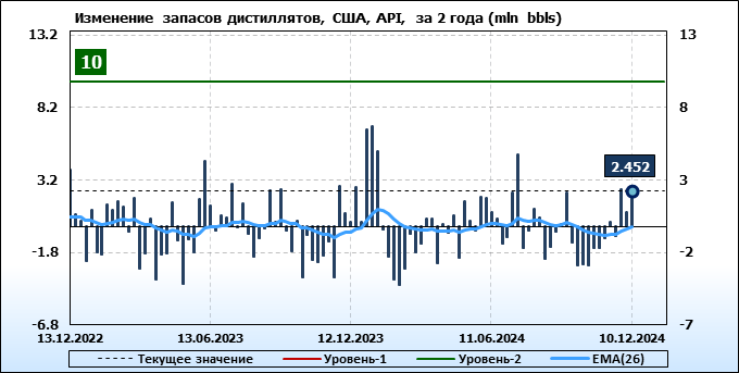 Запасы дистиллятов в США по данным института API выросли на 2.452 млн. баррелей.