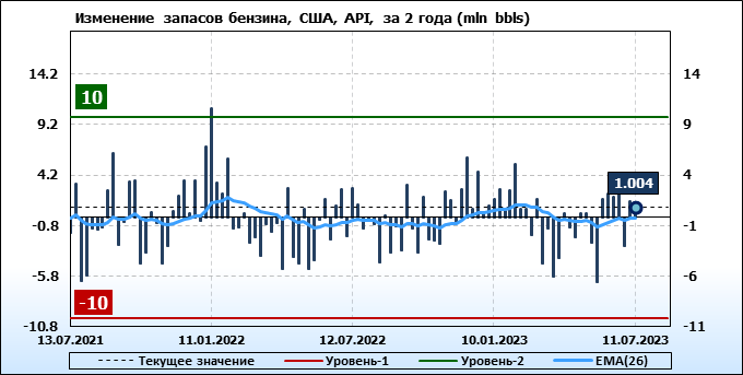 Запасы бензина в США по данным института API выросли на 1.004 млн. баррелей.