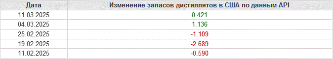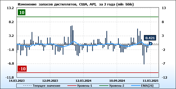 Запасы дистиллятов в США по данным института API выросли на 0.421 млн. баррелей.