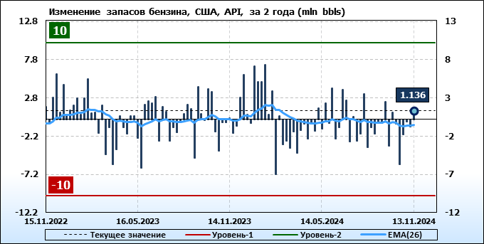 Запасы бензина в США по данным института API выросли на 1.136 млн. баррелей.