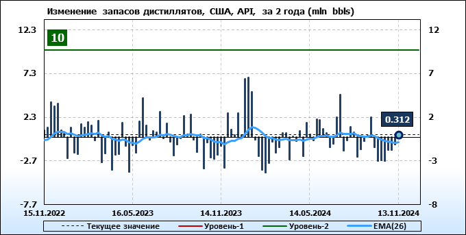 Запасы дистиллятов в США по данным института API выросли на 0.312 млн. баррелей.