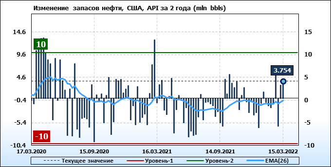 Коммерческие запасы нефти в США по данным института API выросли на 3.754 млн. баррелей, при прогнозе -1.867 млн. баррелей.