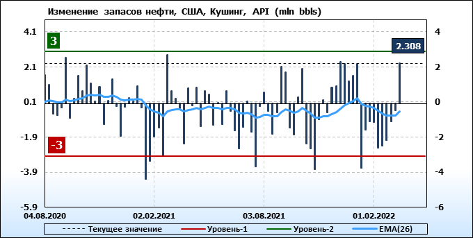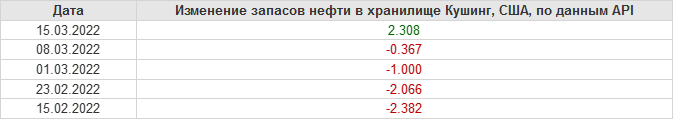 Запасы в хранилище Кушинг по данным института API выросли на 2.308 млн. баррелей.