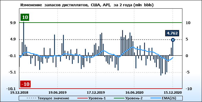 Запасы дистиллятов в США по данным института API выросли на 4.762 млн. баррелей.