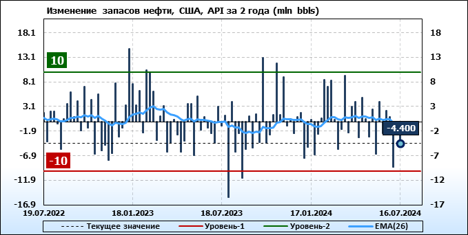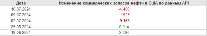 Коммерческие запасы нефти в США по данным института API упали на 4.4 млн. баррелей.