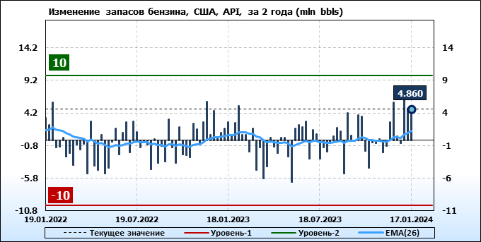 Запасы бензина в США по данным института API выросли на 4.86 млн. баррелей.