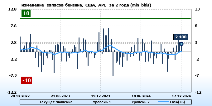 Запасы бензина в США по данным института API выросли на 2.4 млн. баррелей.