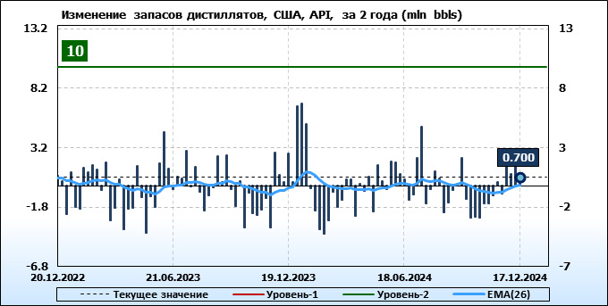 Запасы дистиллятов в США по данным института API выросли на 0.7 млн. баррелей.