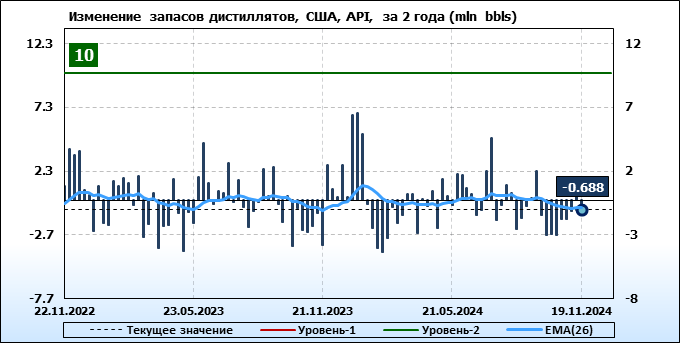 Запасы дистиллятов в США по данным института API упали на 0.688 млн. баррелей.