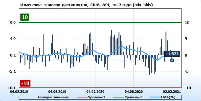 Запасы дистиллятов в США по данным института API упали на 1.622 млн. баррелей.