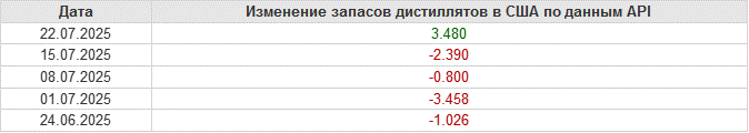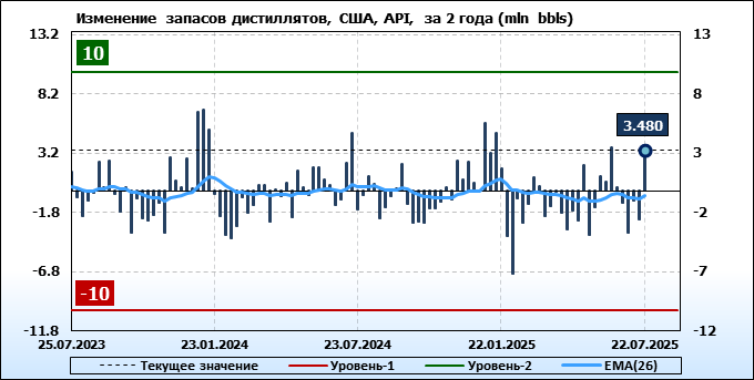 Запасы дистиллятов в США по данным института API выросли на 3.48 млн. баррелей.