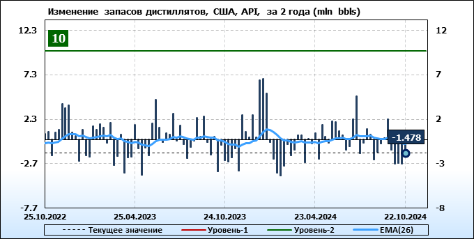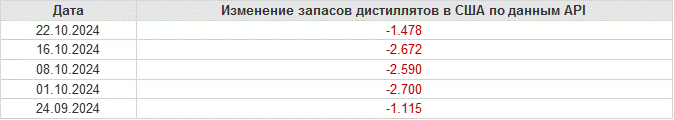Запасы дистиллятов в США по данным института API упали на 1.478 млн. баррелей.