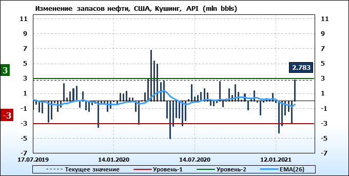 Запасы в хранилище Кушинг по данным института API выросли на 2.783 млн. баррелей.